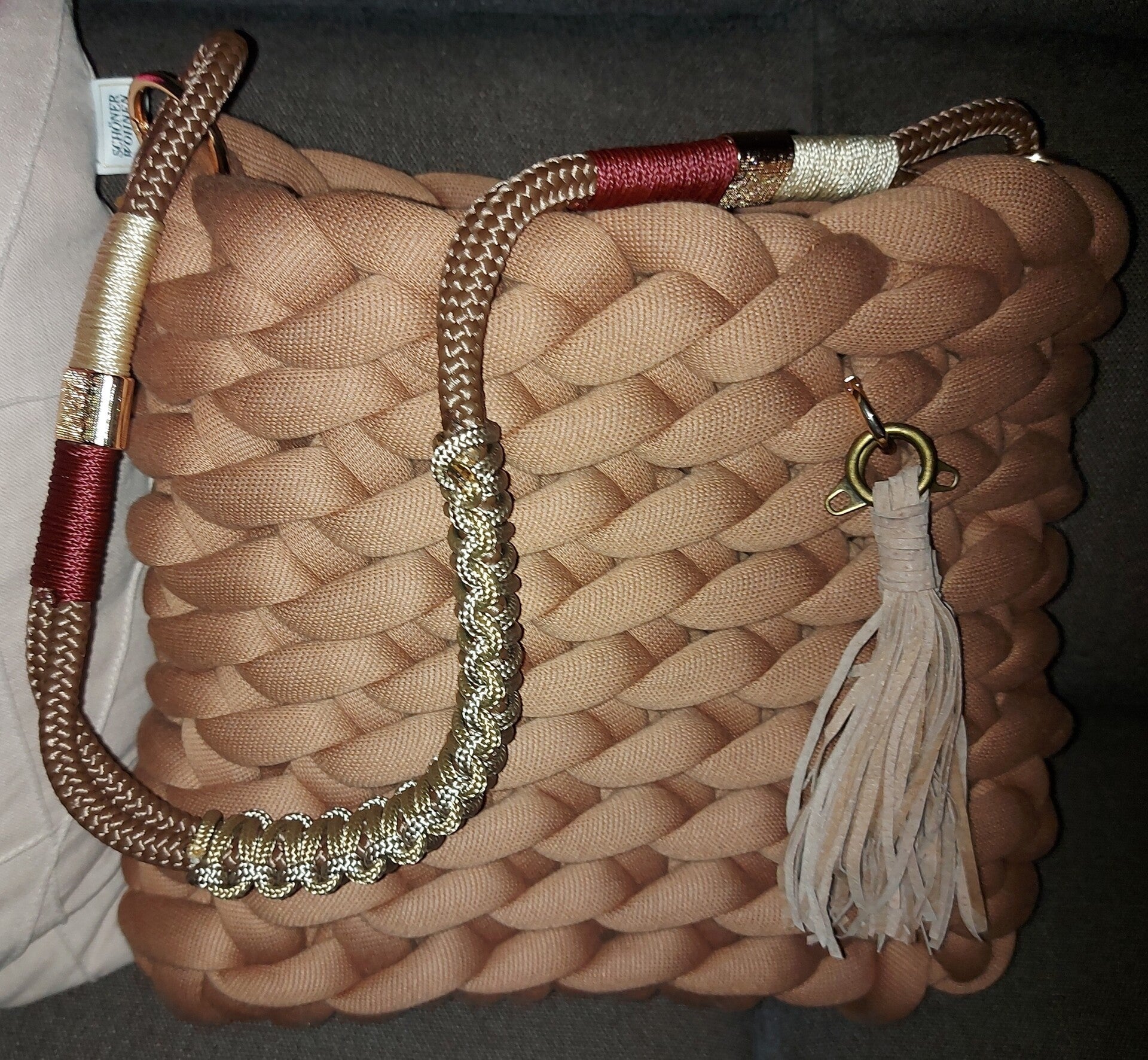 Classicbag L in edlem terrosso (braun) in premium cotton mit Paracordgurt 2 farbig Ton-in-Ton, wendbar mit Lederfransenquaste
